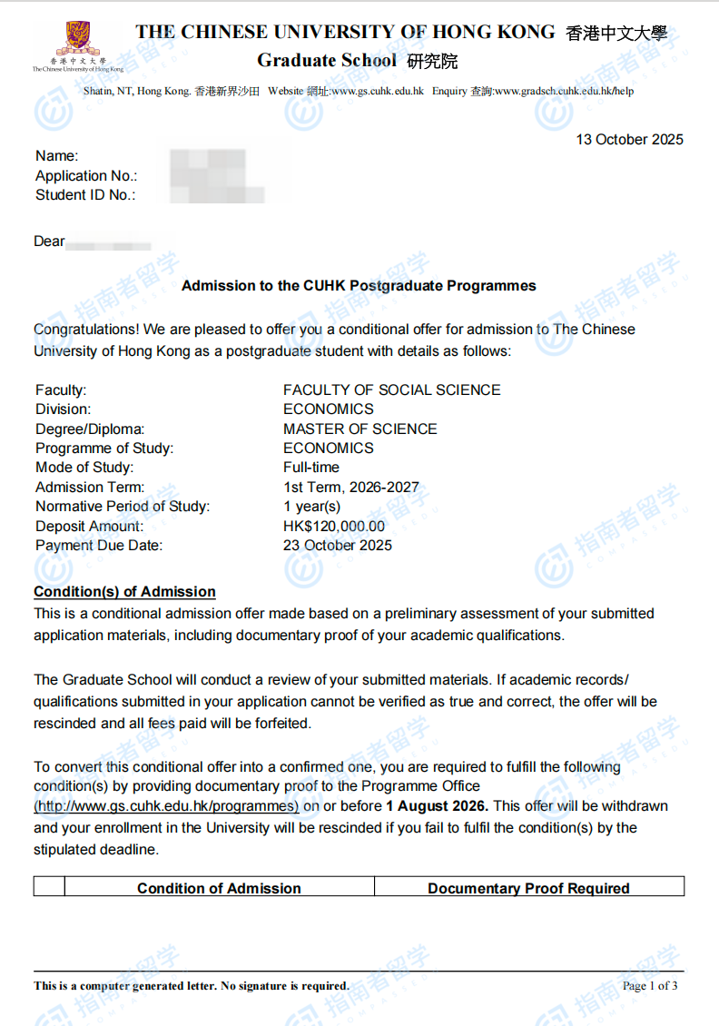 香港中文大學(xué)經(jīng)濟學(xué)理學(xué)碩士研究生offer一枚