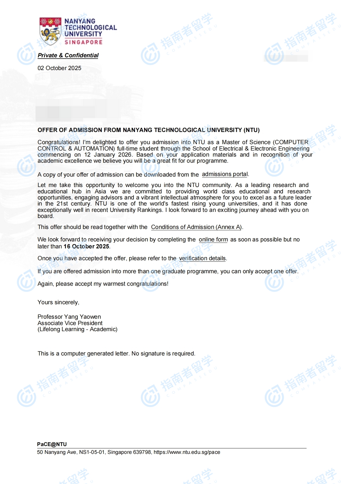 南洋理工大學(xué)計(jì)算機(jī)控制與自動(dòng)化理學(xué)碩士研究生offer一枚