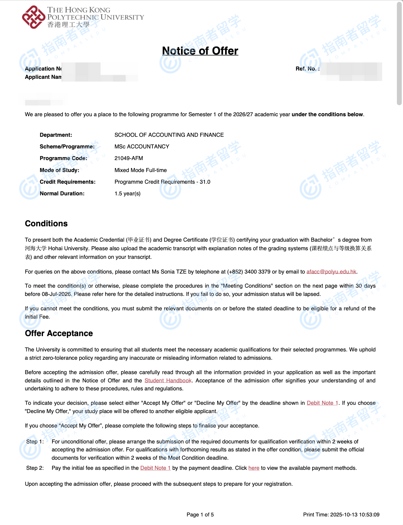 香港理工大學(xué)會計學(xué)理學(xué)碩士研究生offer一枚