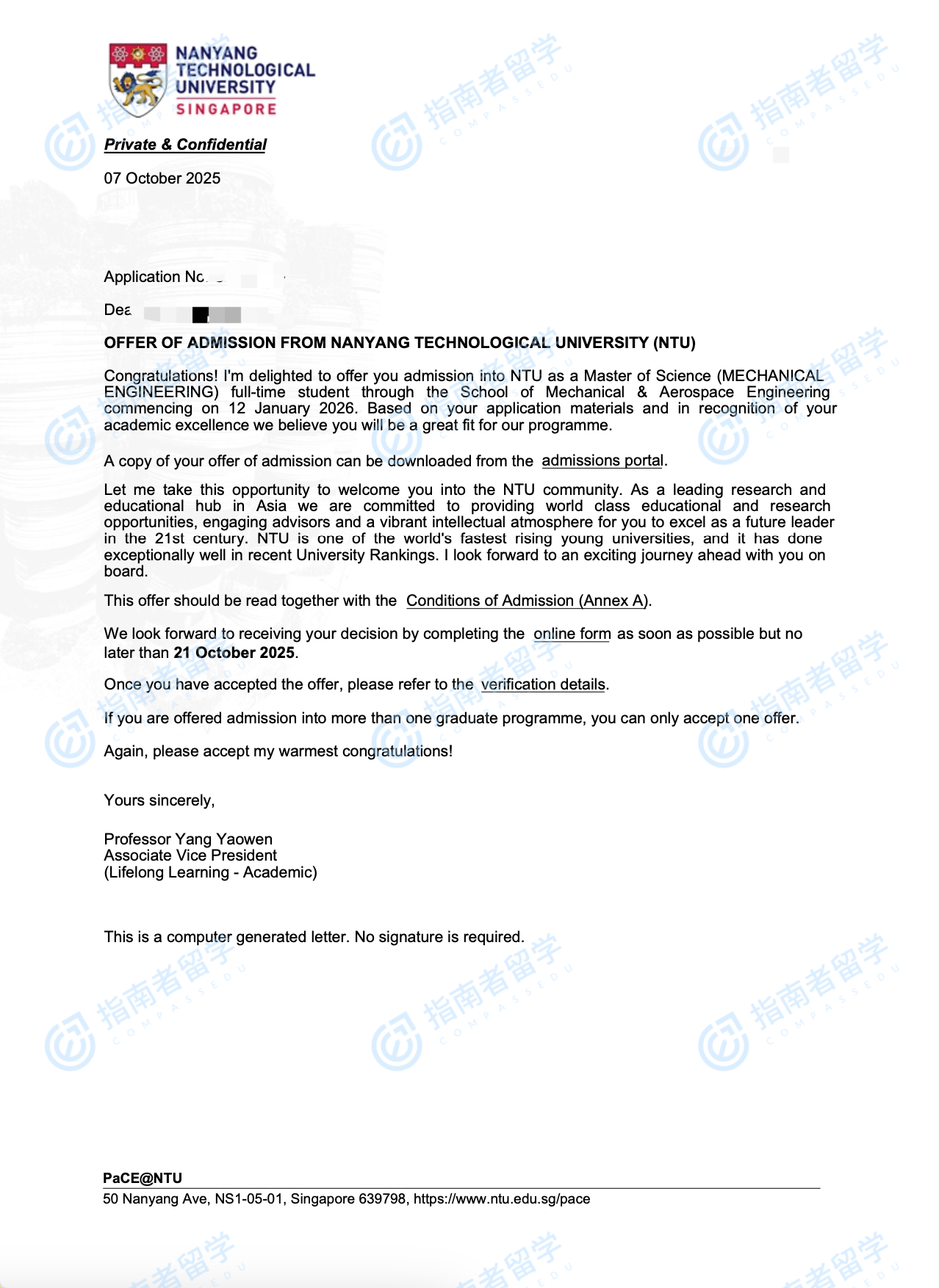 南洋理工大學機械工程理學碩士研究生offer一枚