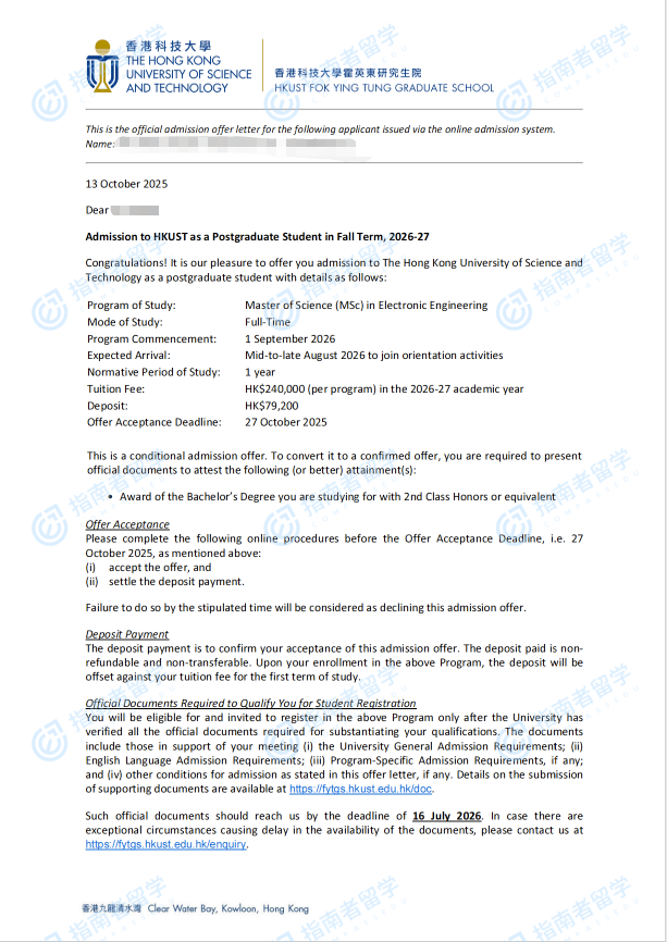 香港科技大學(xué)電子工程理學(xué)碩士研究生offer一枚