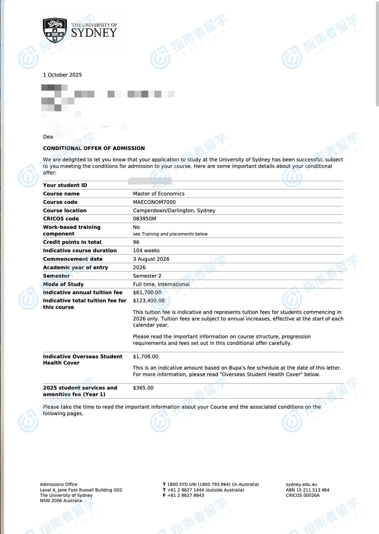 悉尼大學經(jīng)濟學碩士研究生offer一枚