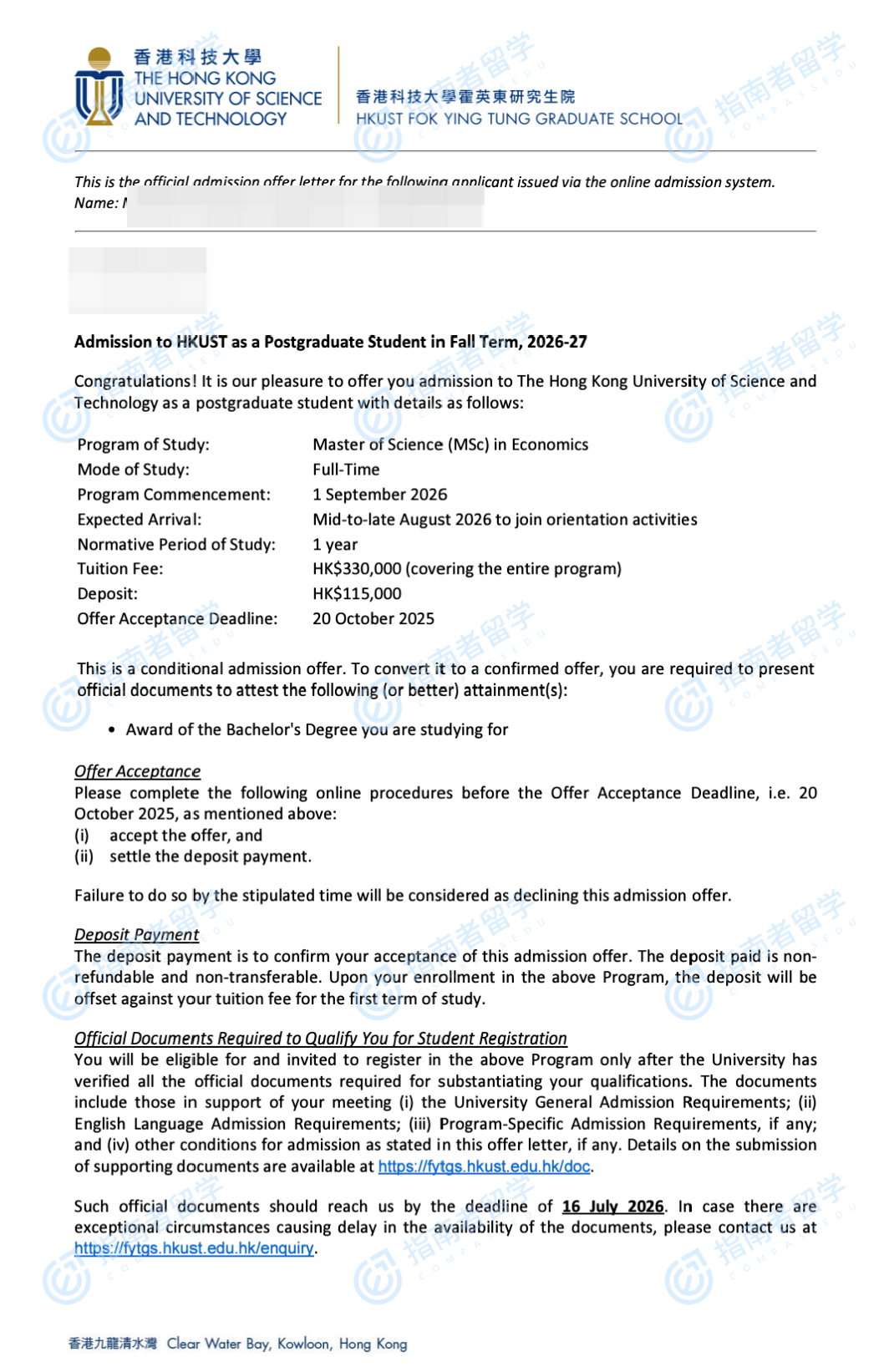 香港科技大學經(jīng)濟學理學碩士研究生offer一枚