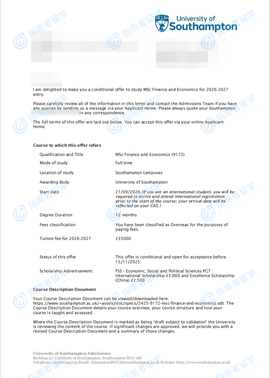 南安普頓大學(xué)金融與經(jīng)濟(jì)理學(xué)碩士研究生offer一枚