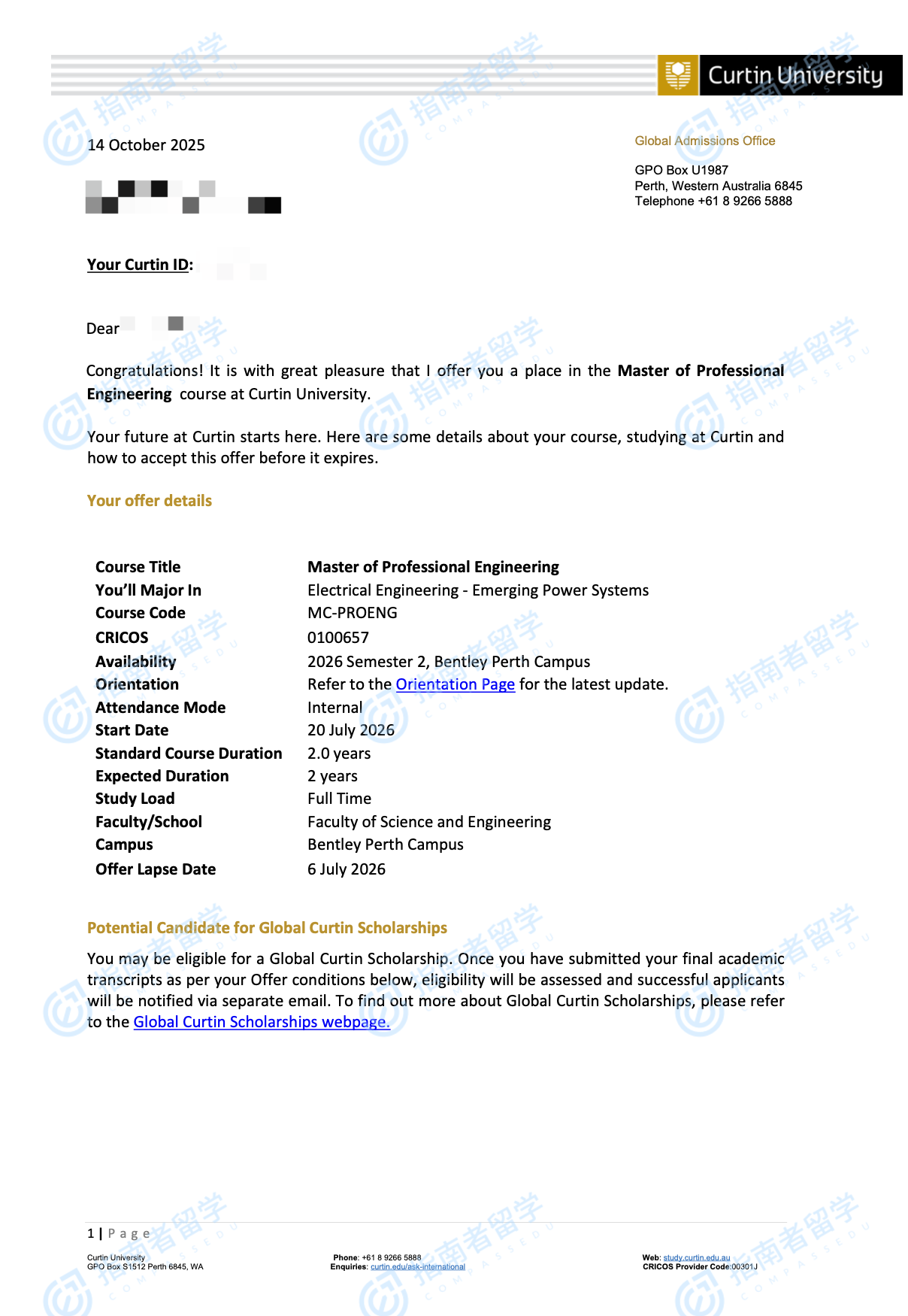 科廷大學(xué)專業(yè)工程碩士研究生offer一枚