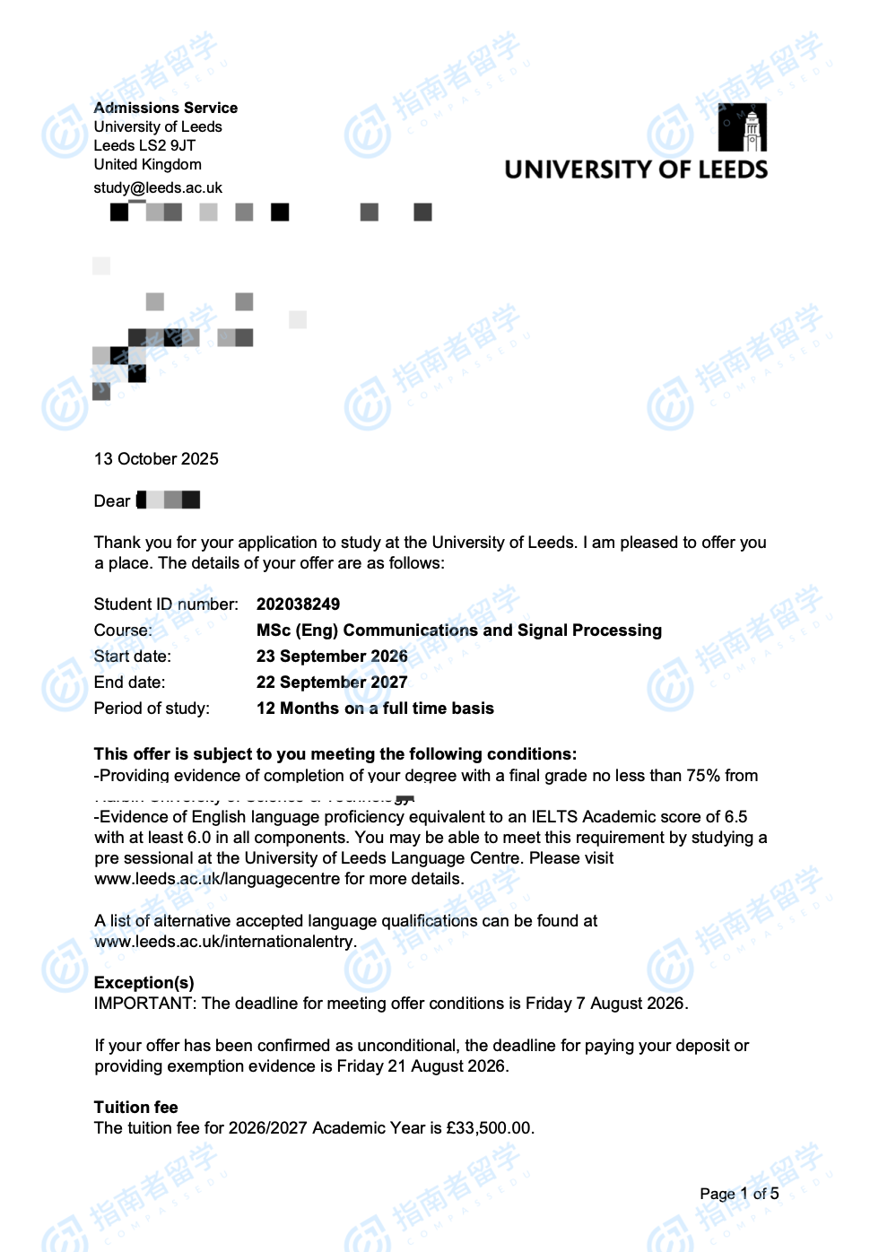 利茲大學(xué)通信與信號(hào)處理(工程)理學(xué)碩士研究生offer一枚