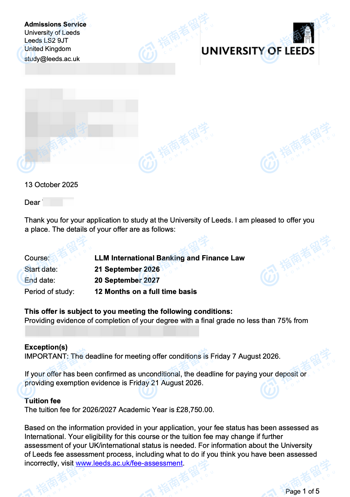 利茲大學(xué)國(guó)際銀行與金融法法學(xué)碩士研究生offer一枚