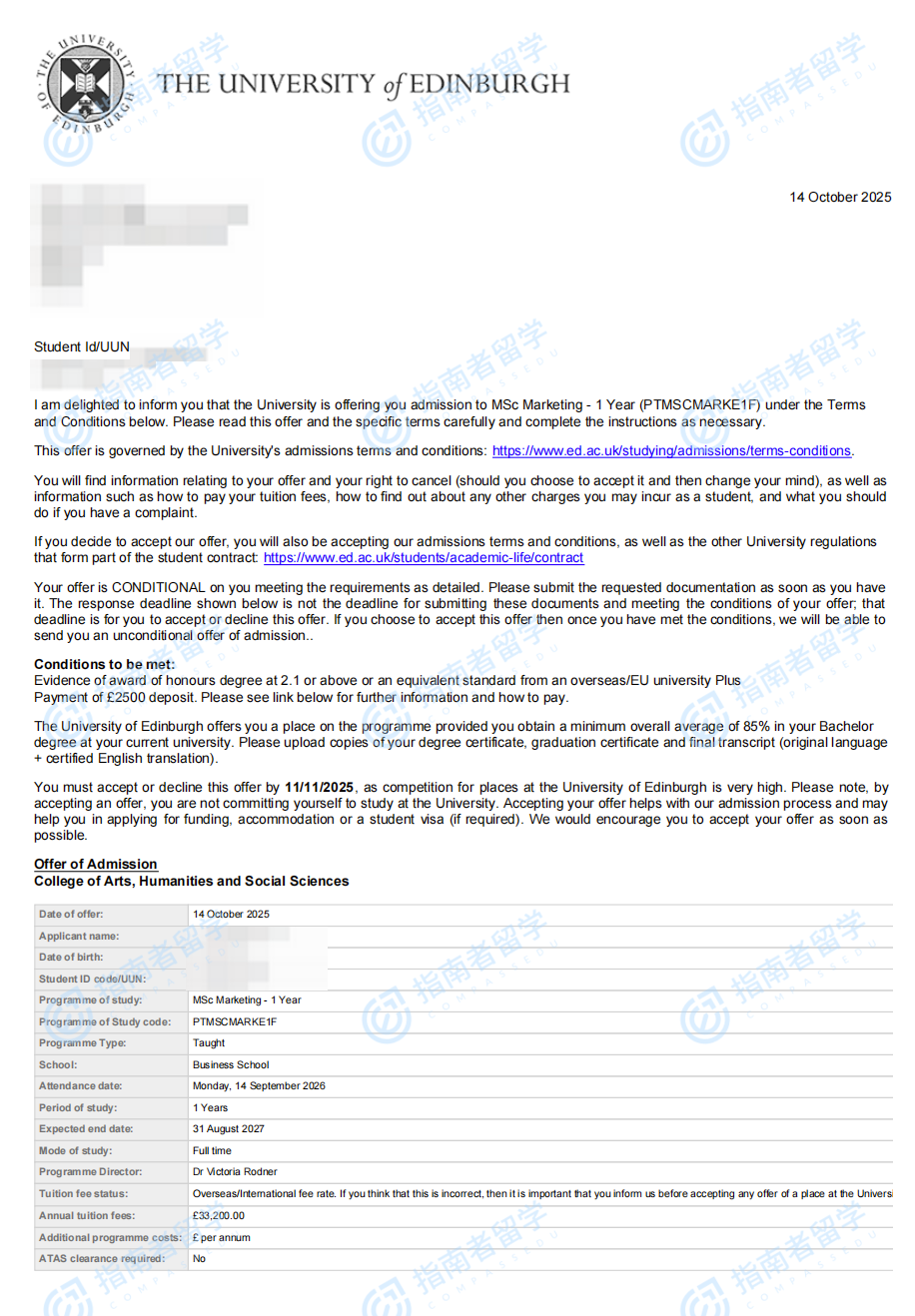 愛丁堡大學市場營銷理學碩士研究生offer一枚