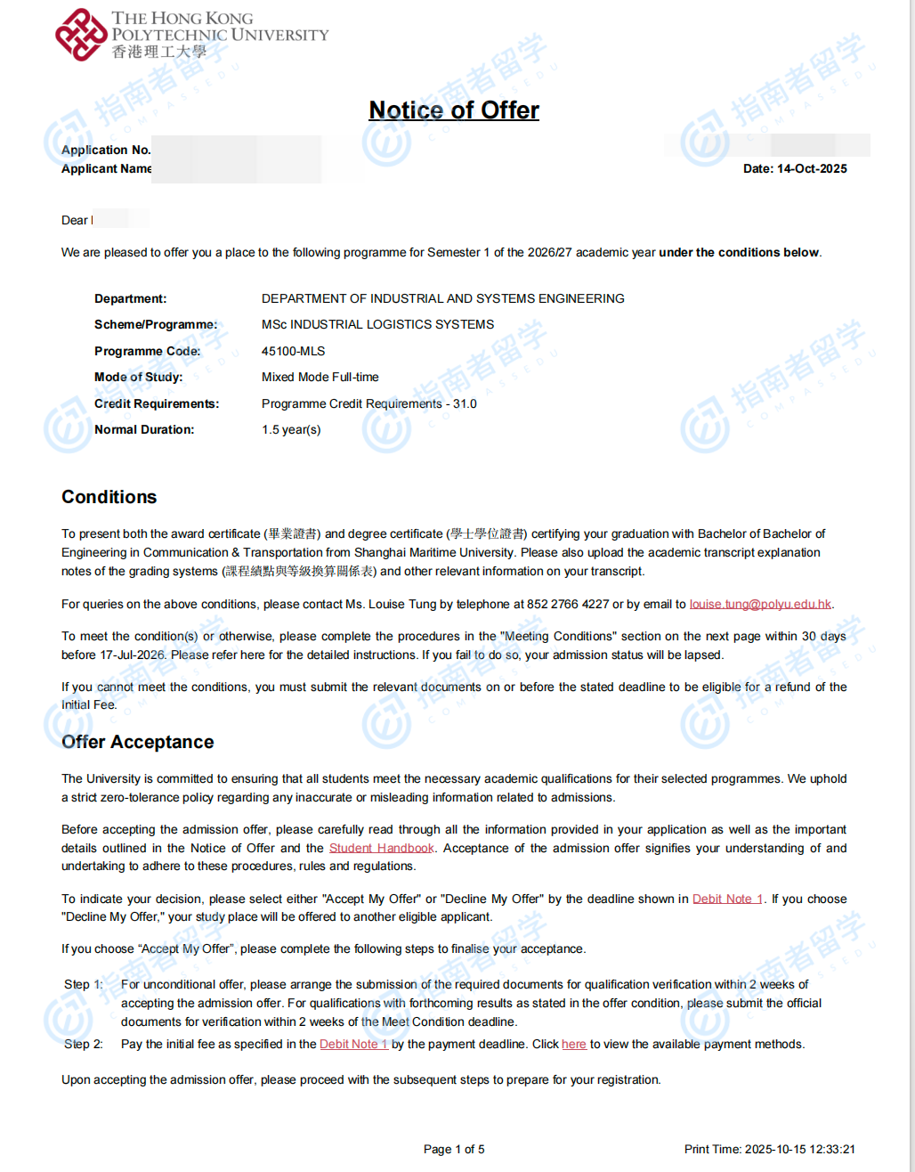 香港理工大學(xué)工業(yè)物流系統(tǒng)理學(xué)碩士研究生offer一枚