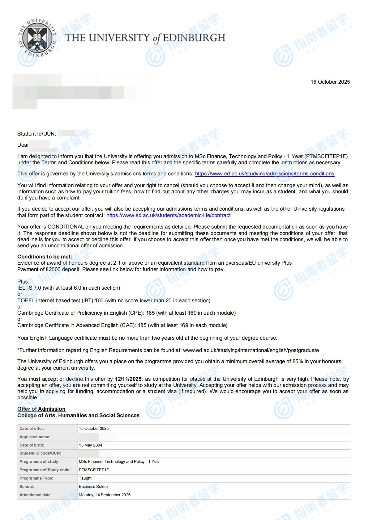 愛丁堡大學(xué)金融、科技與政策理學(xué)碩士研究生offer一枚