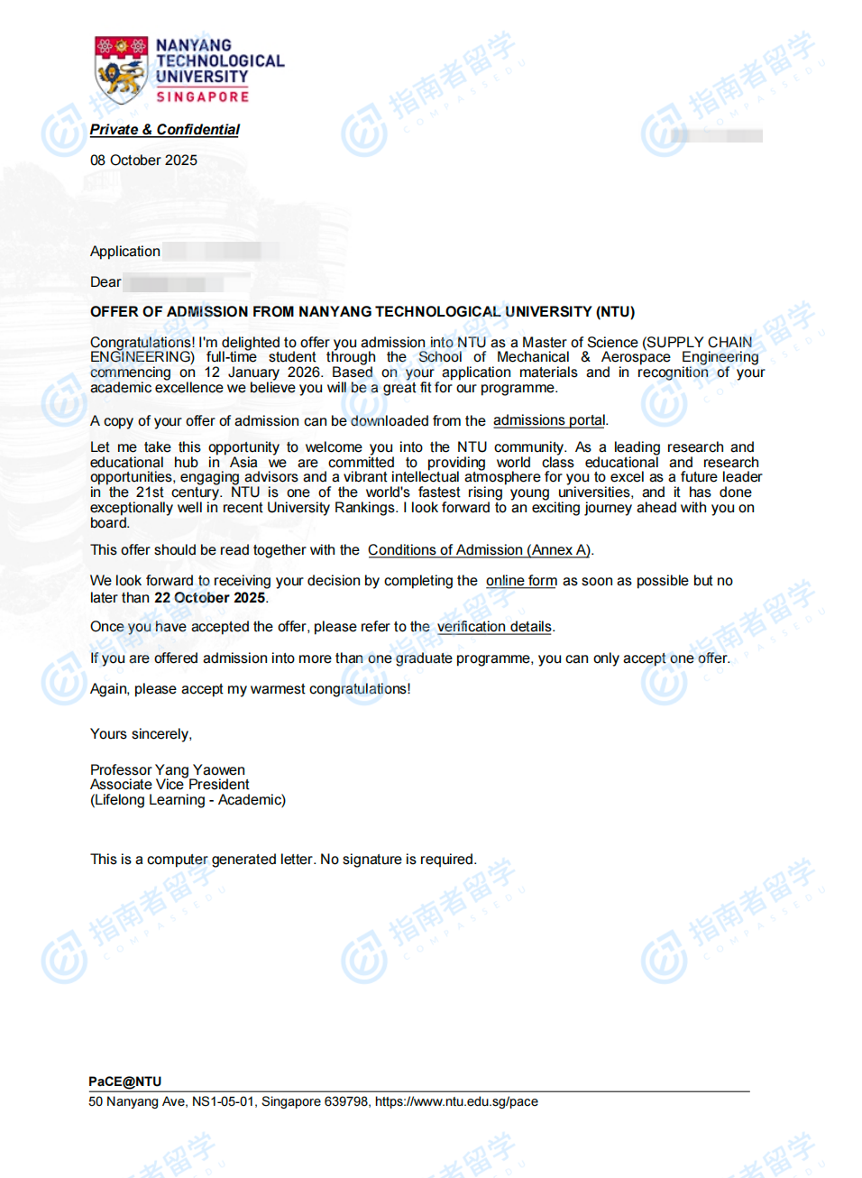 南洋理工大學(xué)供應(yīng)鏈工程理學(xué)碩士研究生offer一枚