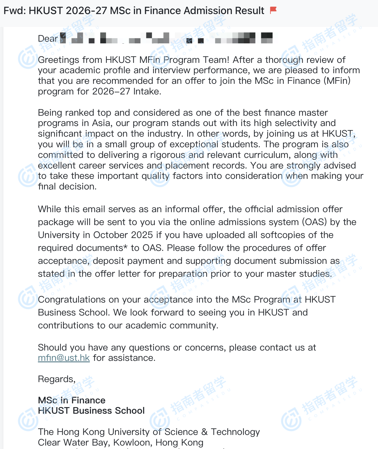 香港科技大學(xué)金融學(xué)理學(xué)碩士研究生offer一枚
