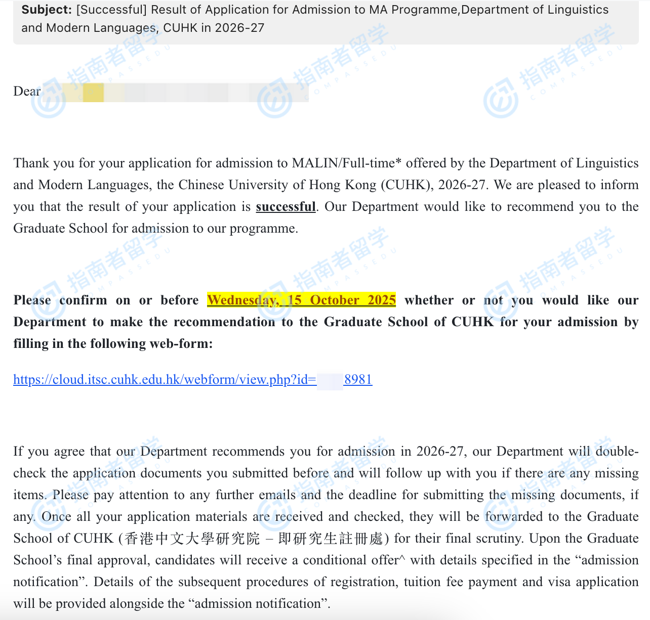 香港中文大學(xué)語言學(xué)文學(xué)碩士研究生offer一枚