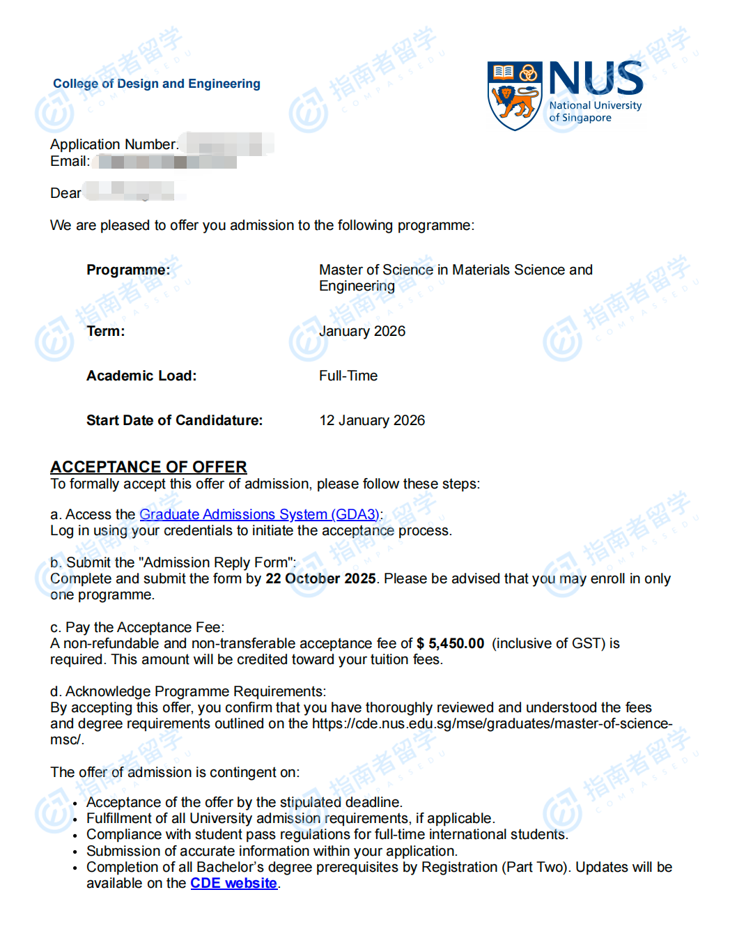 新加坡國立大學材料科學與工程理學碩士研究生offer一枚