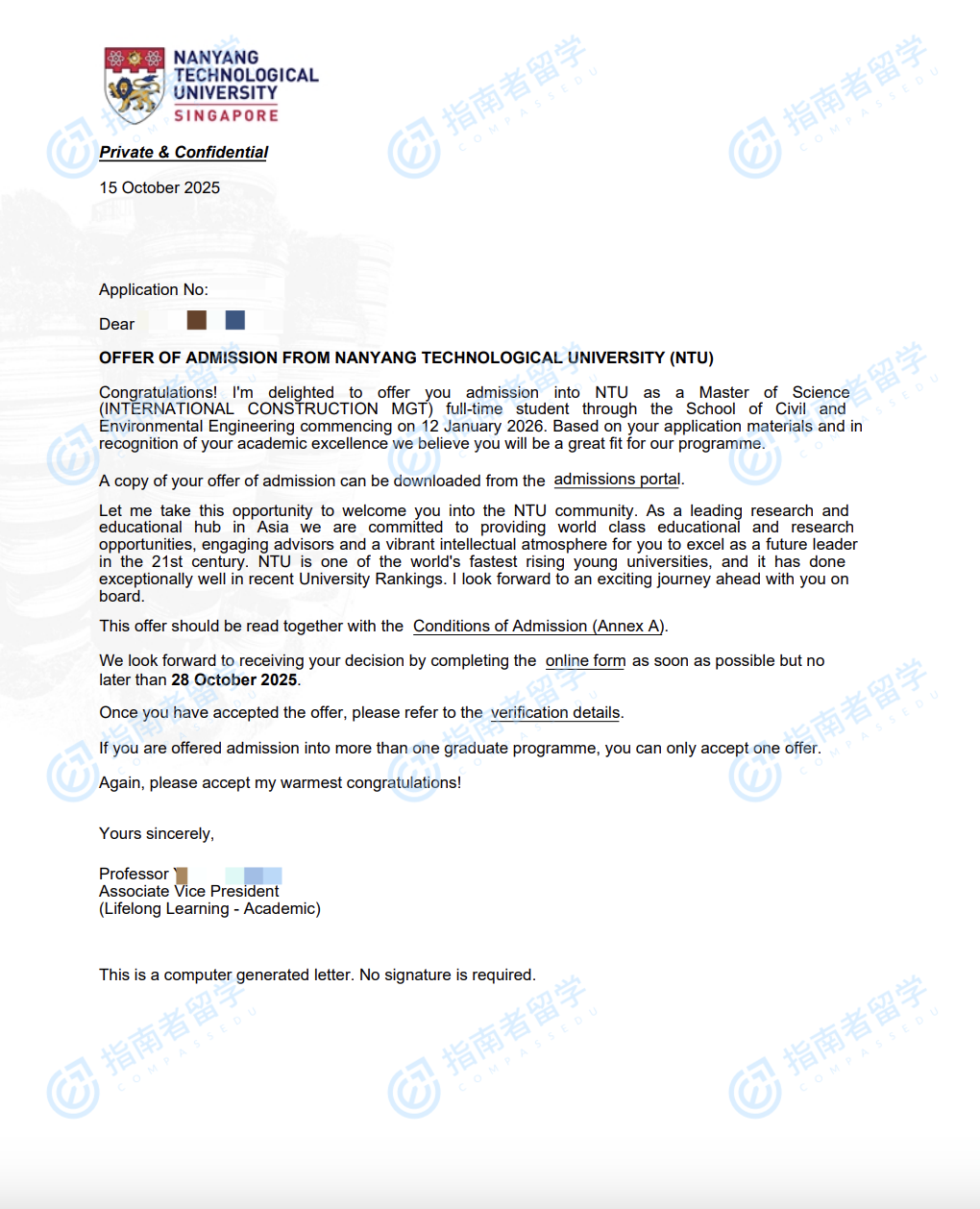 南洋理工大學(xué)國際建筑管理理學(xué)碩士研究生offer一枚