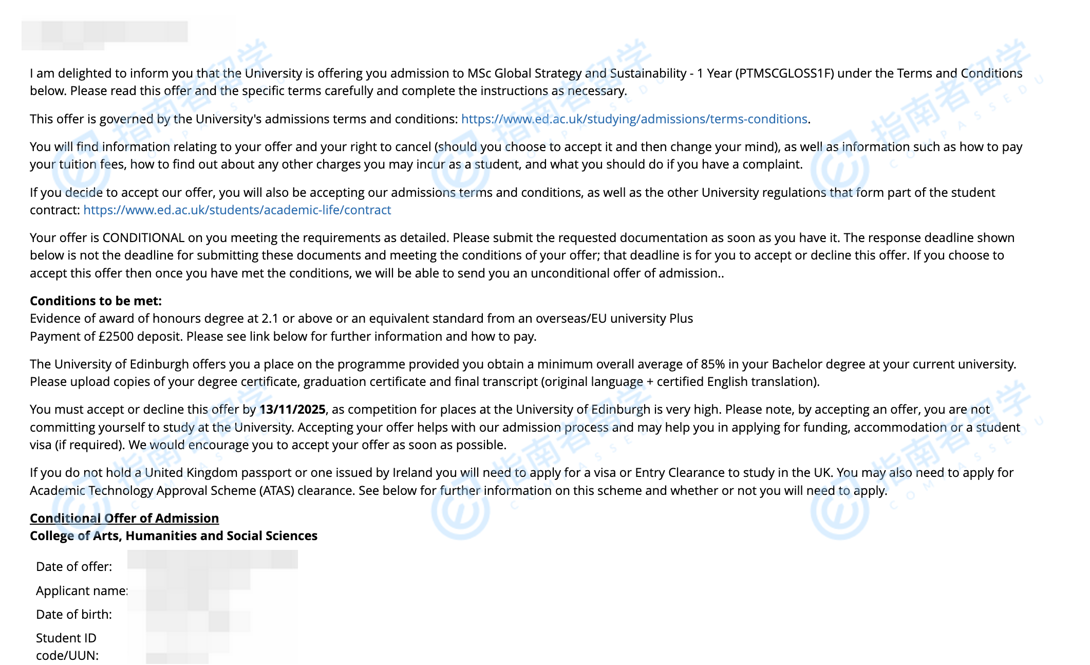愛丁堡大學(xué)管理學(xué)理學(xué)碩士研究生offer一枚