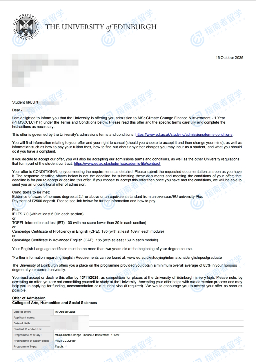 愛丁堡大學氣候變化金融與投資理學碩士研究生offer一枚