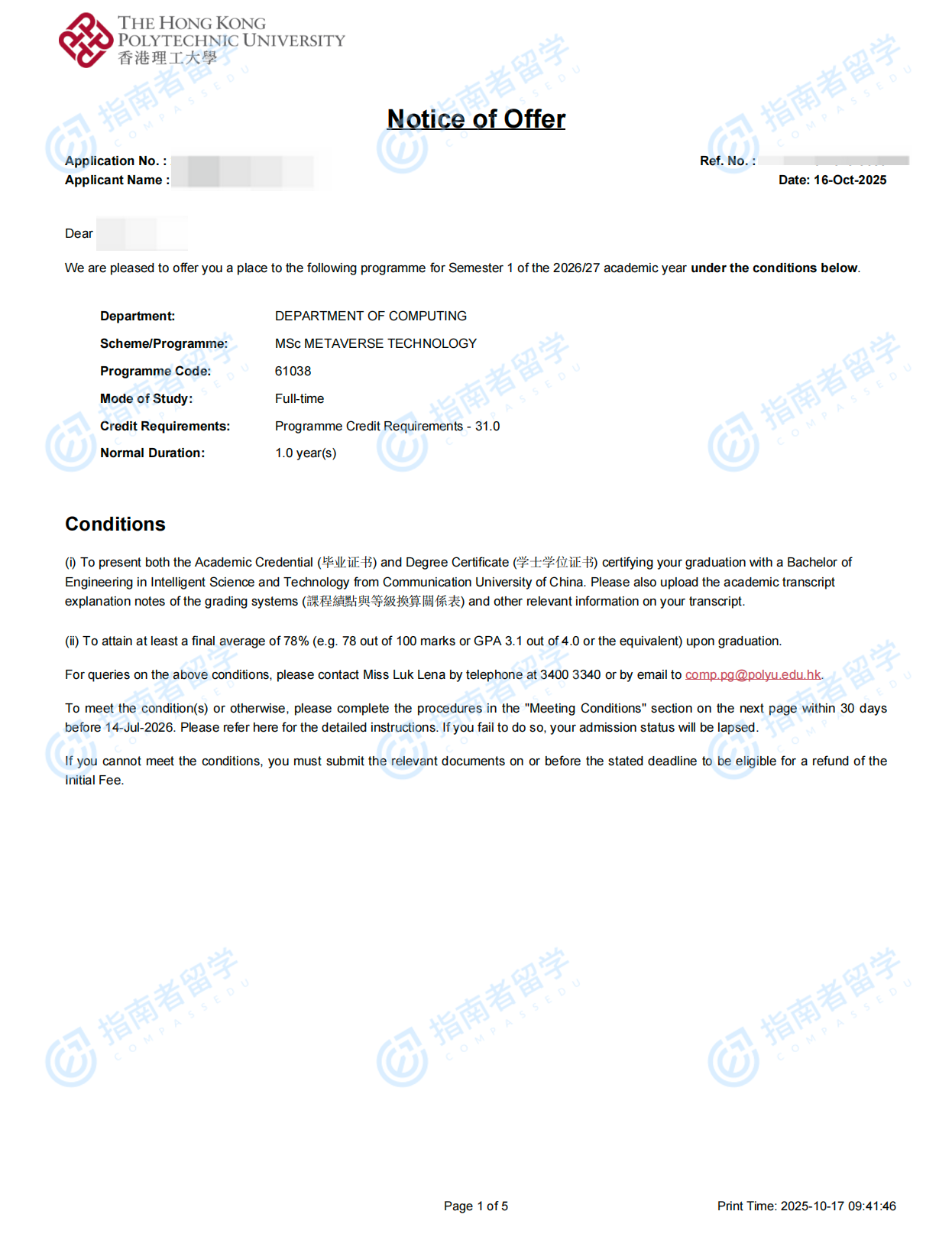 香港理工大學元宇宙科技理學碩士研究生offer一枚