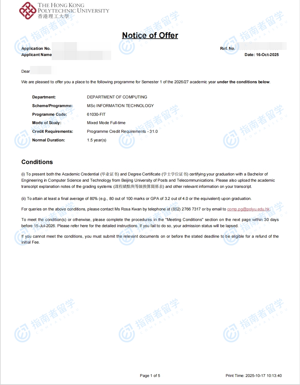 香港理工大學(xué)資訊科技理學(xué)碩士研究生offer一枚