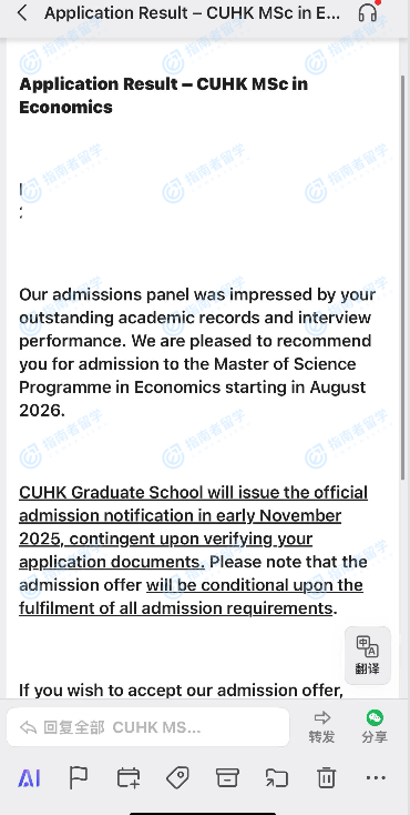 香港中文大學(xué)經(jīng)濟(jì)學(xué)理學(xué)碩士研究生offer一枚