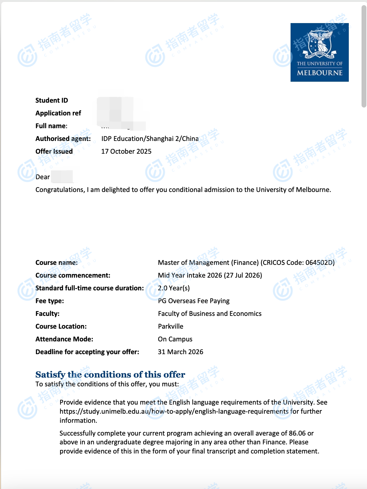 墨爾本大學管理學碩士(金融學)研究生offer一枚