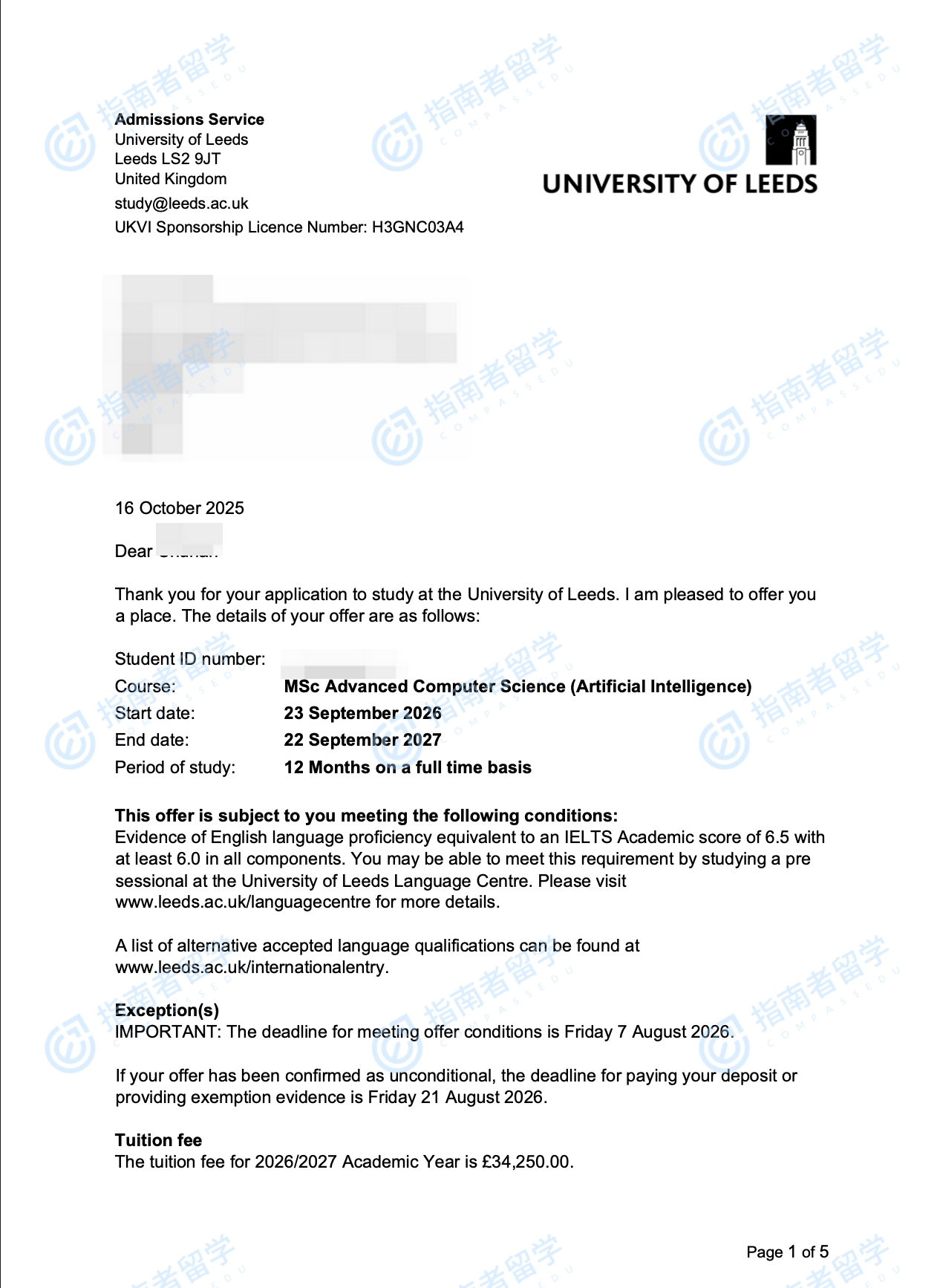 利茲大學(xué)高級(jí)計(jì)算機(jī)科學(xué)(人工智能)理學(xué)碩士研究生offer一枚