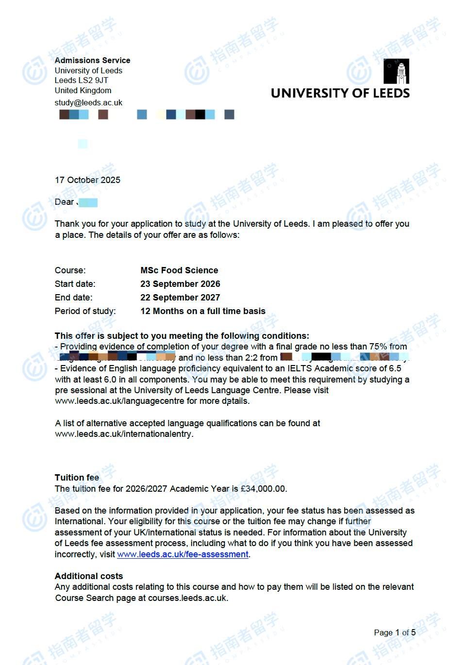 利茲大學(xué)食品科學(xué)理學(xué)碩士研究生offer一枚