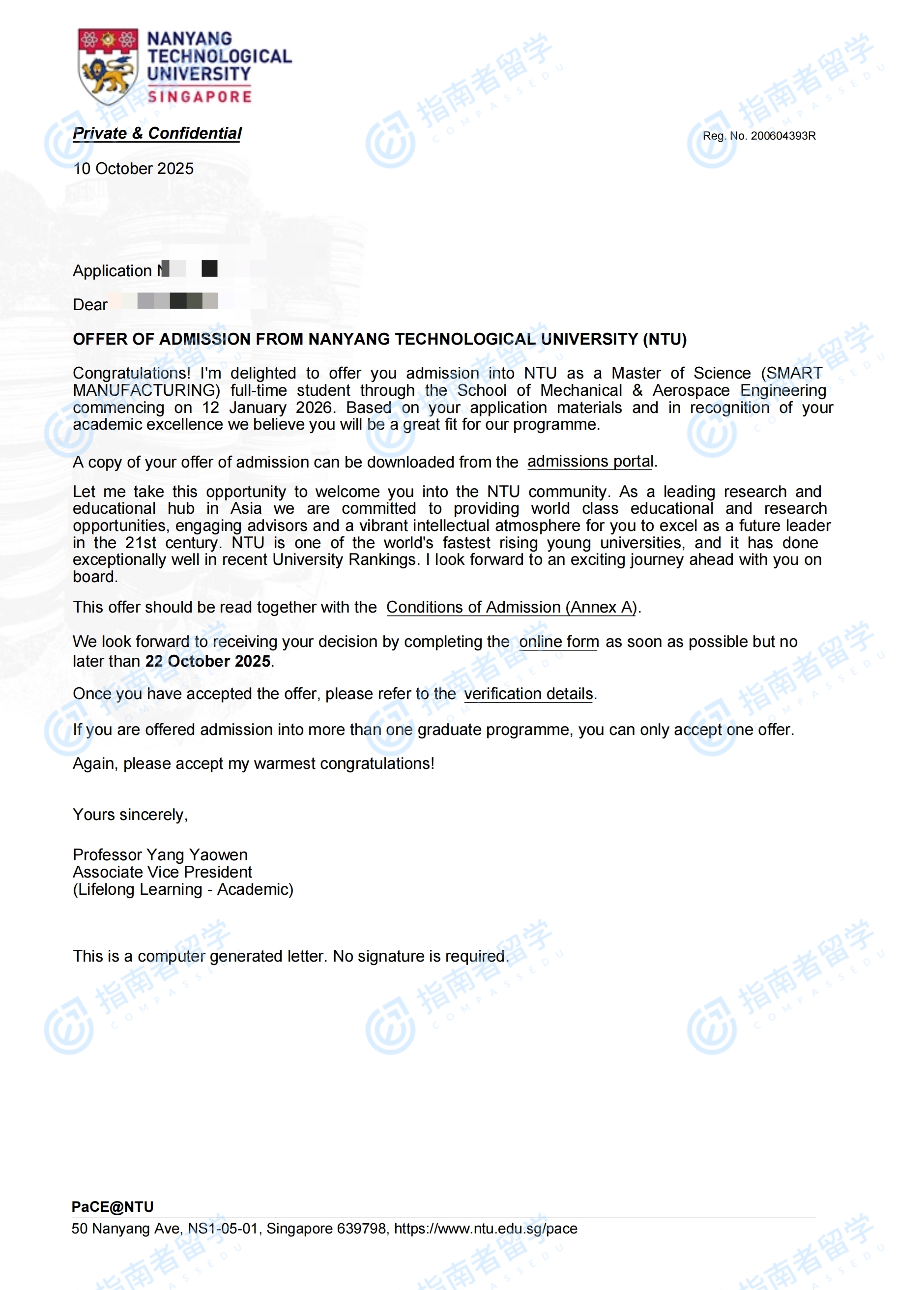 南洋理工大學(xué)智能制造理學(xué)碩士研究生offer一枚