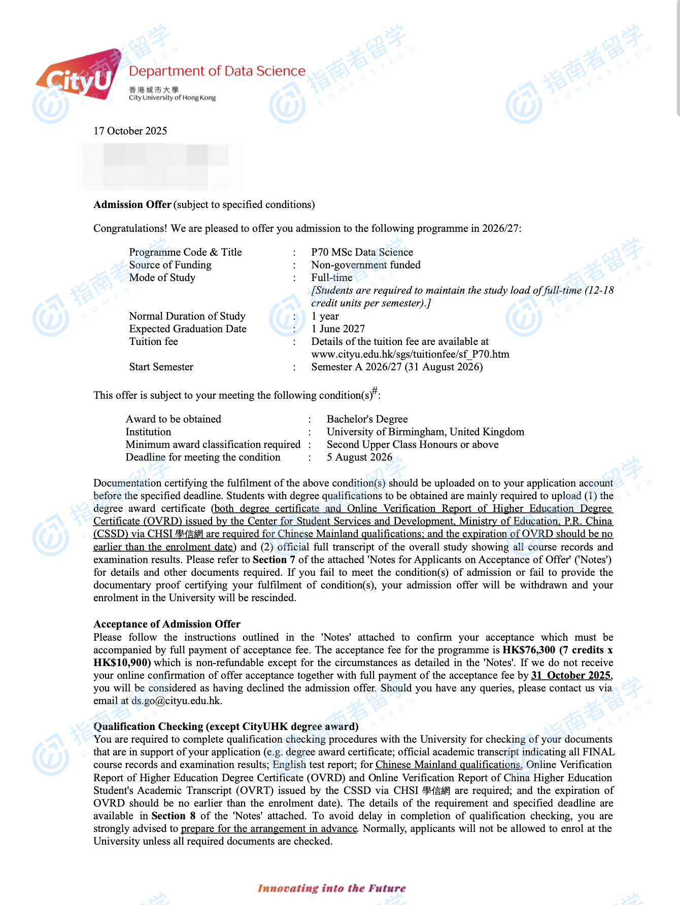 香港城市大學(xué)數(shù)據(jù)科學(xué)理學(xué)碩士研究生offer一枚