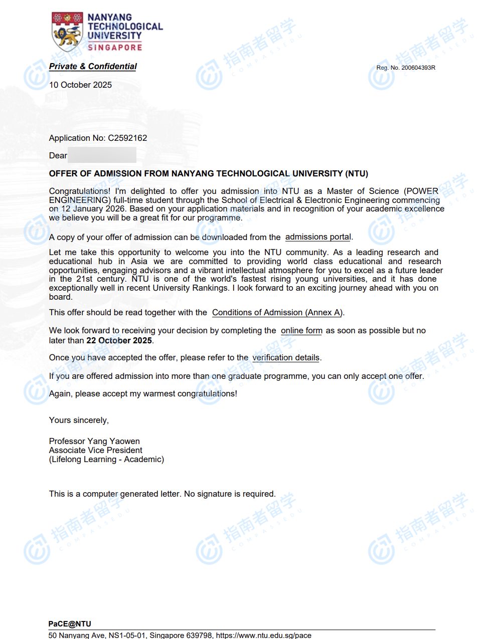 南洋理工大學(xué)電力工程理學(xué)碩士研究生offer一枚