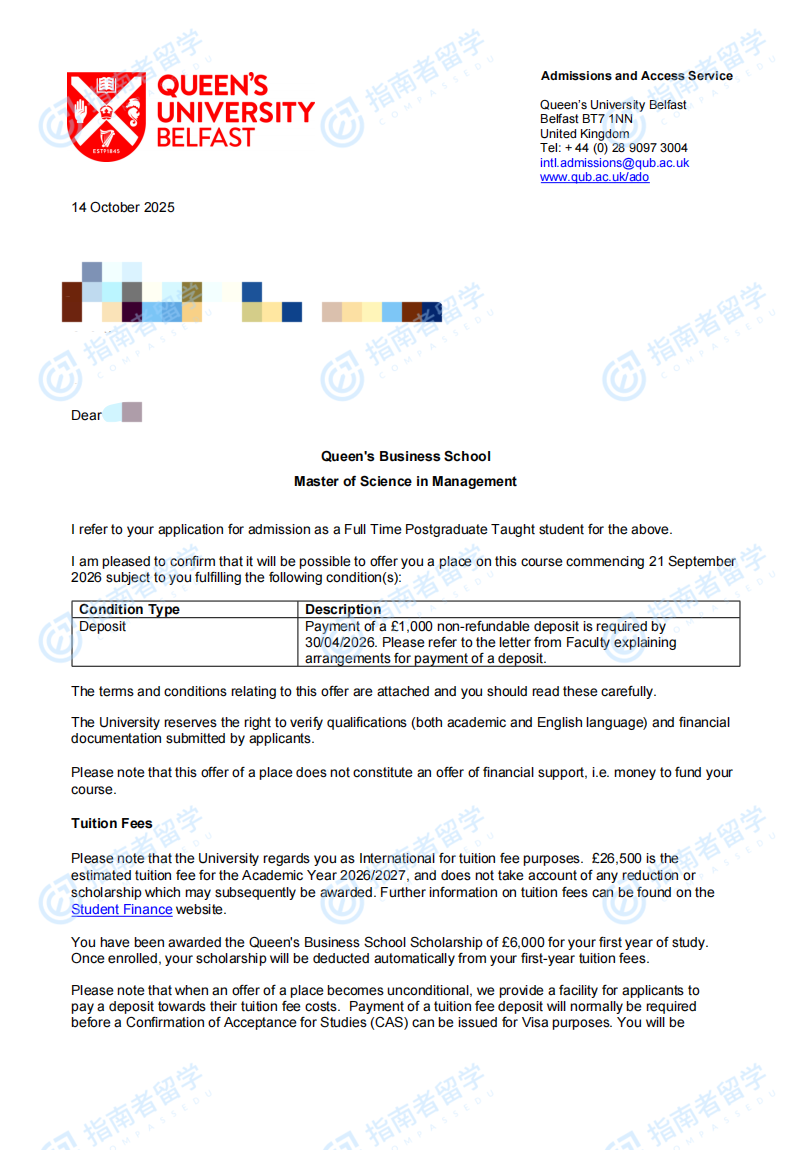貝爾法斯特女王大學(xué)管理學(xué)理學(xué)碩士研究生offer一枚