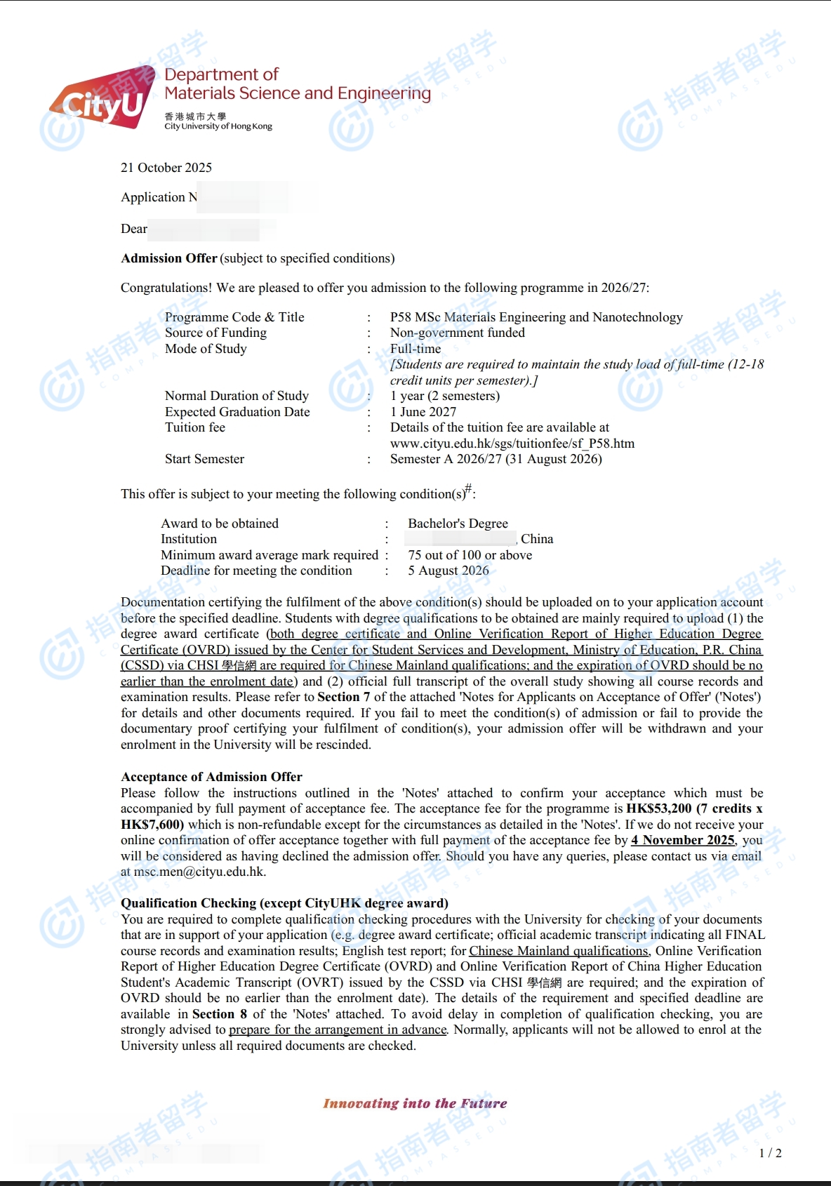 香港城市大學(xué)材料工程與納米技術(shù)理學(xué)碩士研究生offer一枚