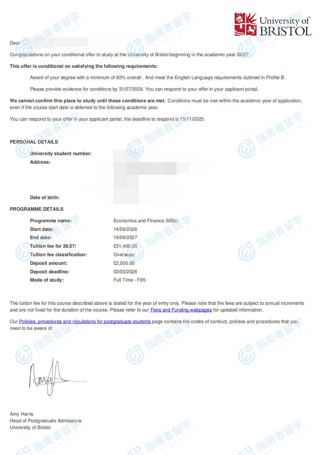 布里斯托大學經濟與金融理學碩士研究生offer一枚