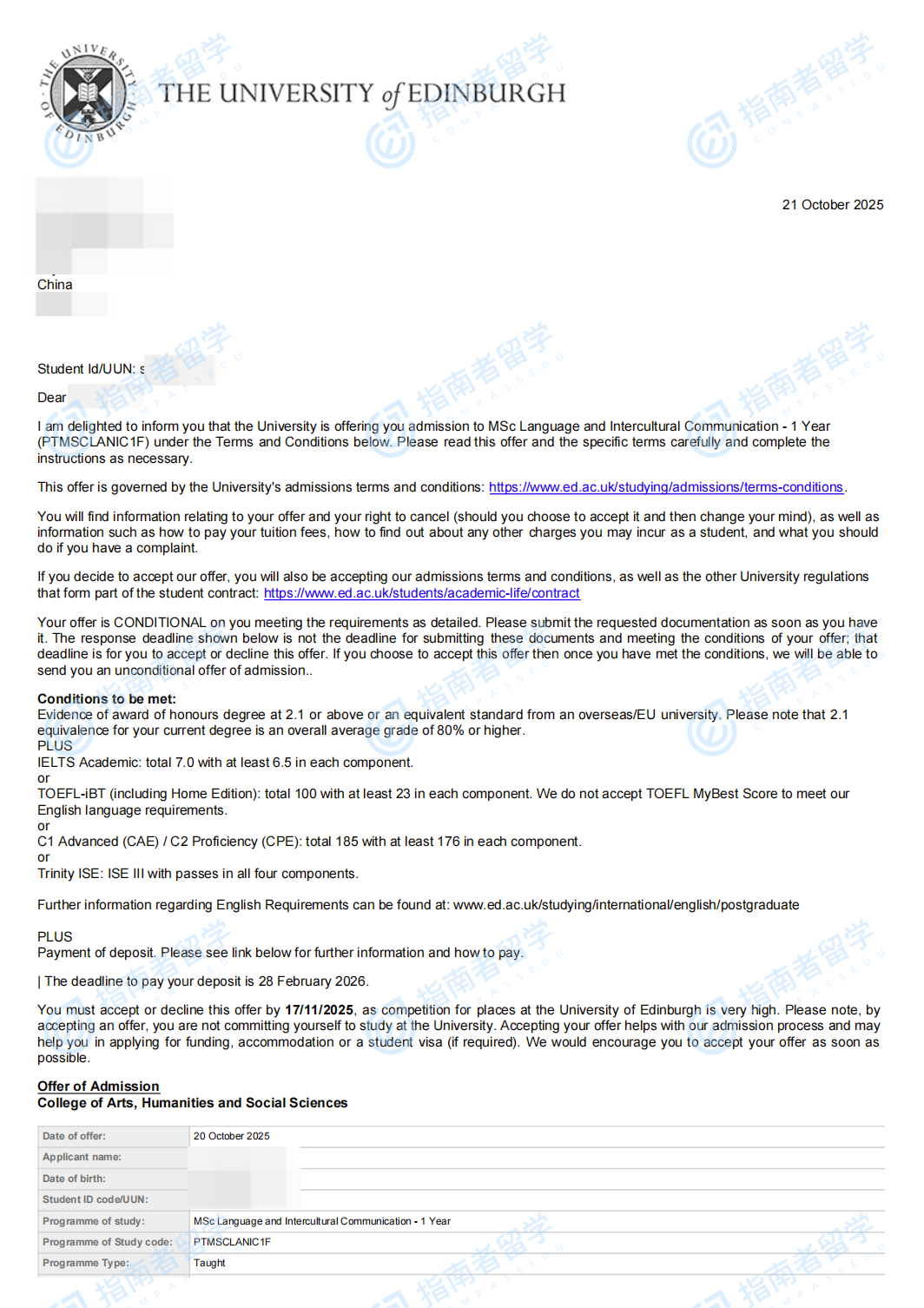 愛丁堡大學(xué)語言與跨文化交流理學(xué)碩士研究生offer一枚