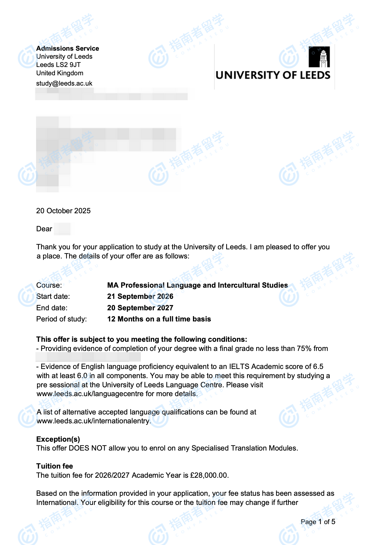 利茲大學(xué)專業(yè)語言與跨文化研究文學(xué)碩士研究生offer一枚