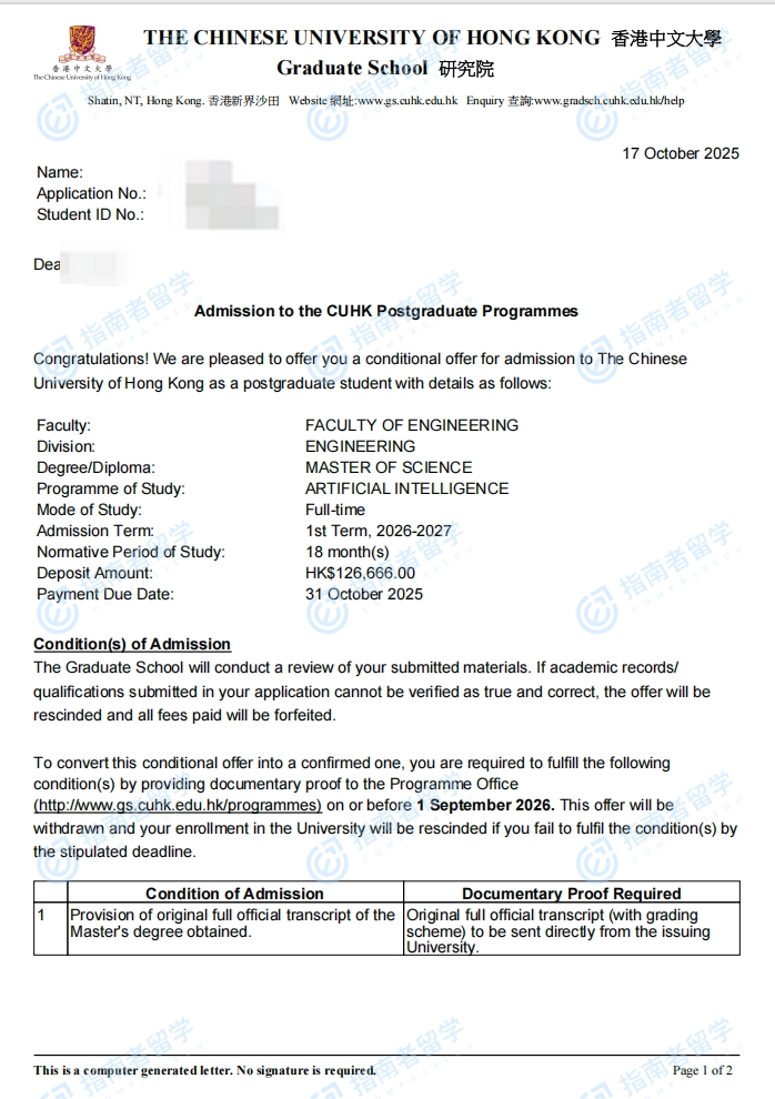 香港中文大學(xué)人工智能理學(xué)碩士研究生offer一枚
