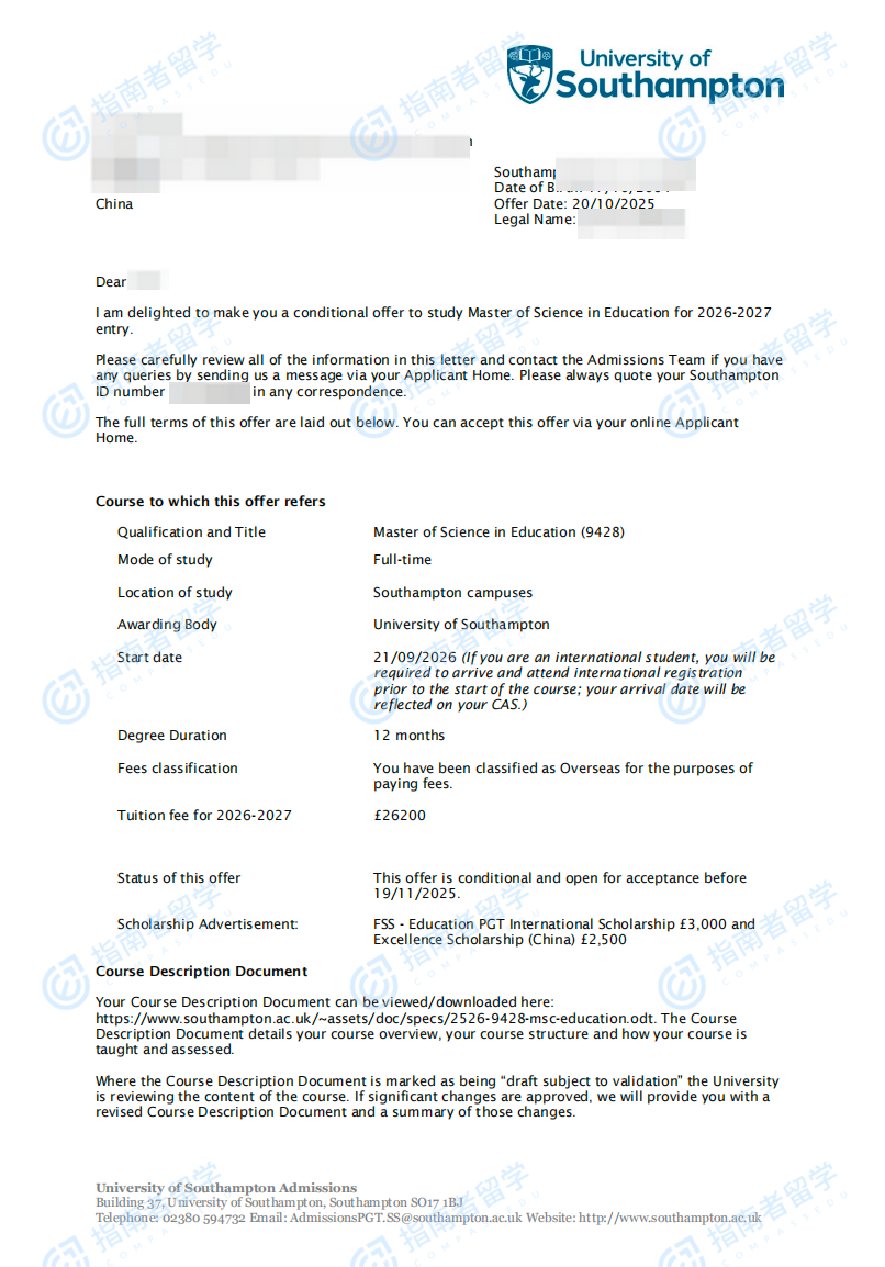 南安普頓大學(xué)教育學(xué)理學(xué)碩士研究生offer一枚