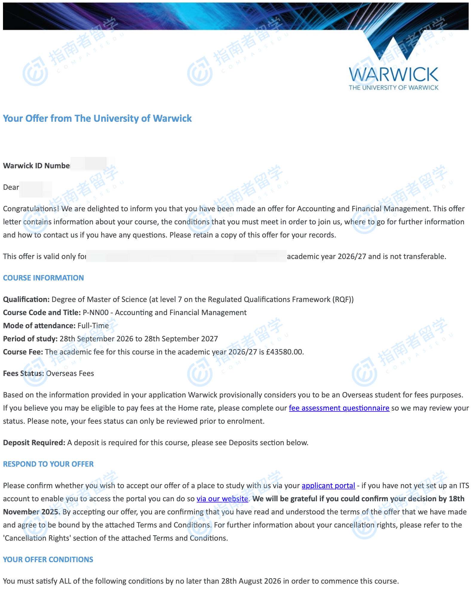 華威大學(xué)會(huì)計(jì)與財(cái)務(wù)管理理學(xué)碩士研究生offer一枚