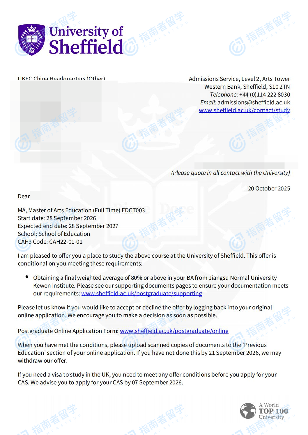 謝菲爾德大學教育學文學碩士研究生offer一枚