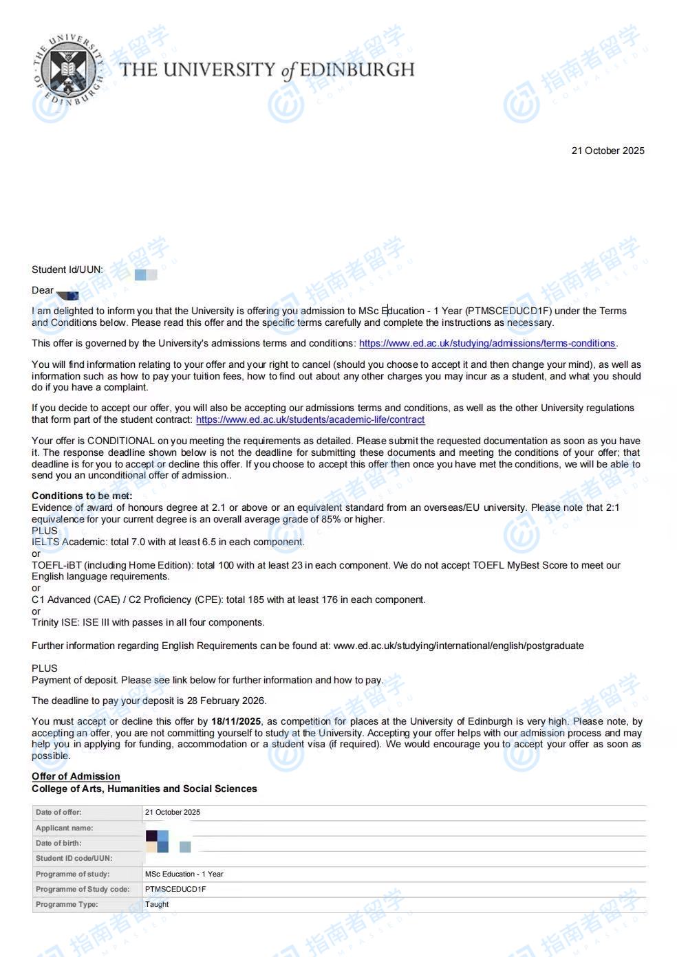 愛丁堡大學(xué)教育學(xué)理學(xué)碩士研究生offer一枚