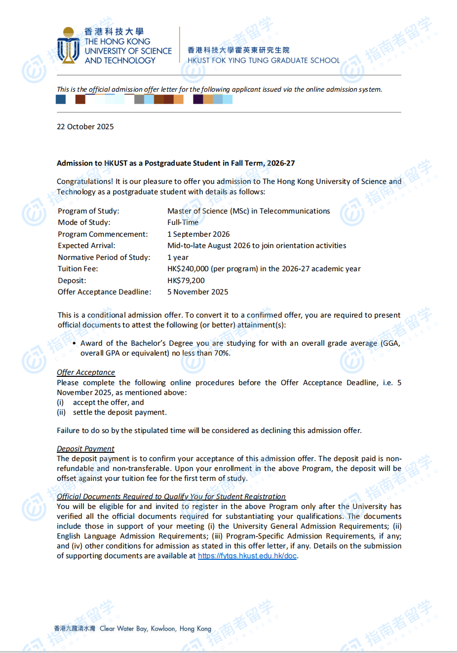 香港科技大學(xué)電信學(xué)理學(xué)碩士研究生offer一枚