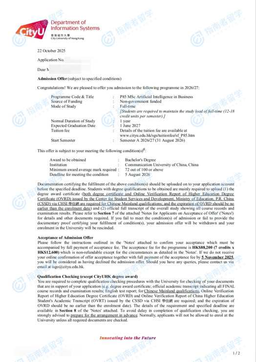 香港城市大學(xué)商業(yè)人工智能理學(xué)碩士研究生offer一枚