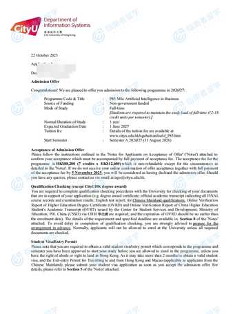 香港城市大學(xué)商業(yè)人工智能理學(xué)碩士研究生offer一枚