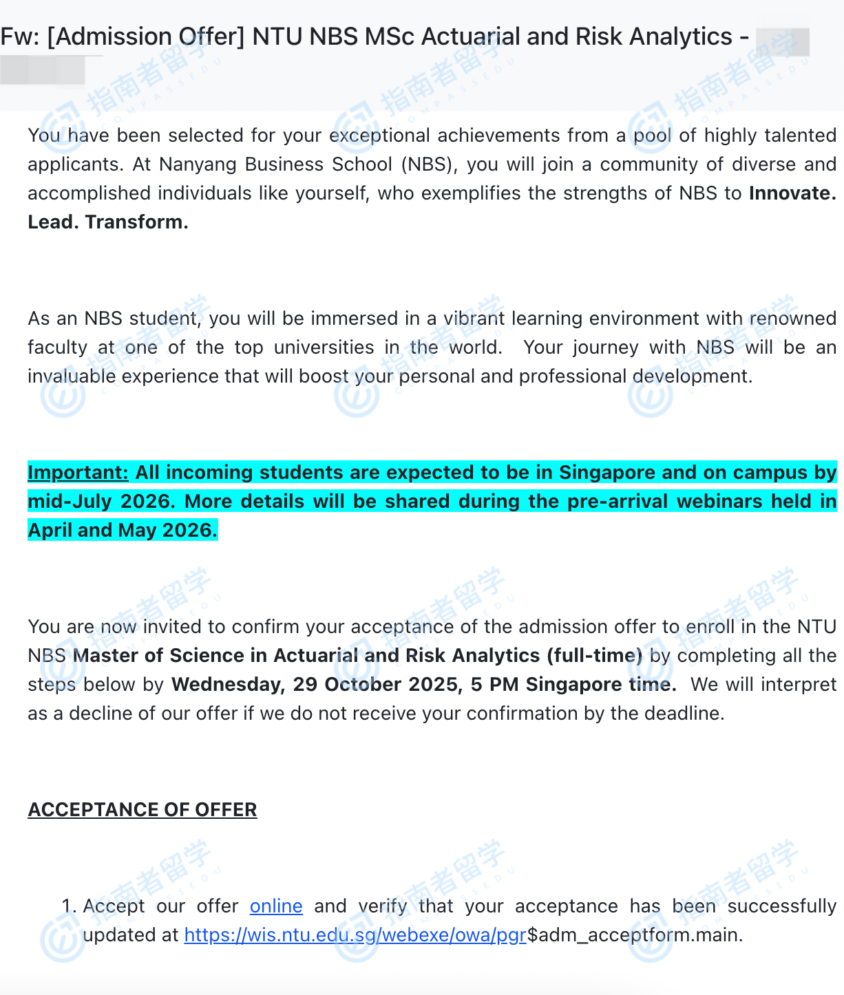 南洋理工大學(xué)精算與風(fēng)險分析理學(xué)碩士研究生offer一枚