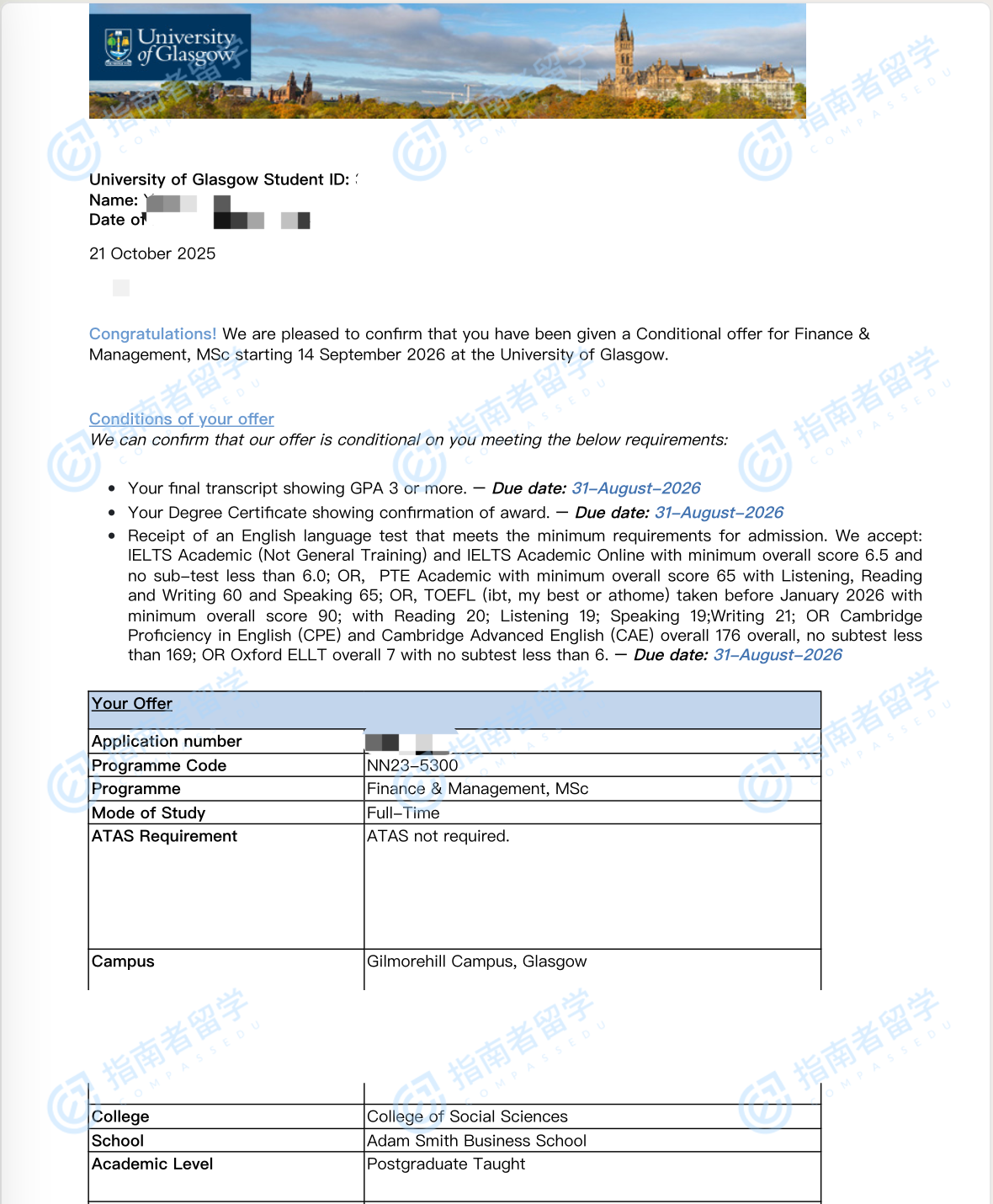 格拉斯哥大學(xué)金融與管理理學(xué)碩士研究生offer一枚
