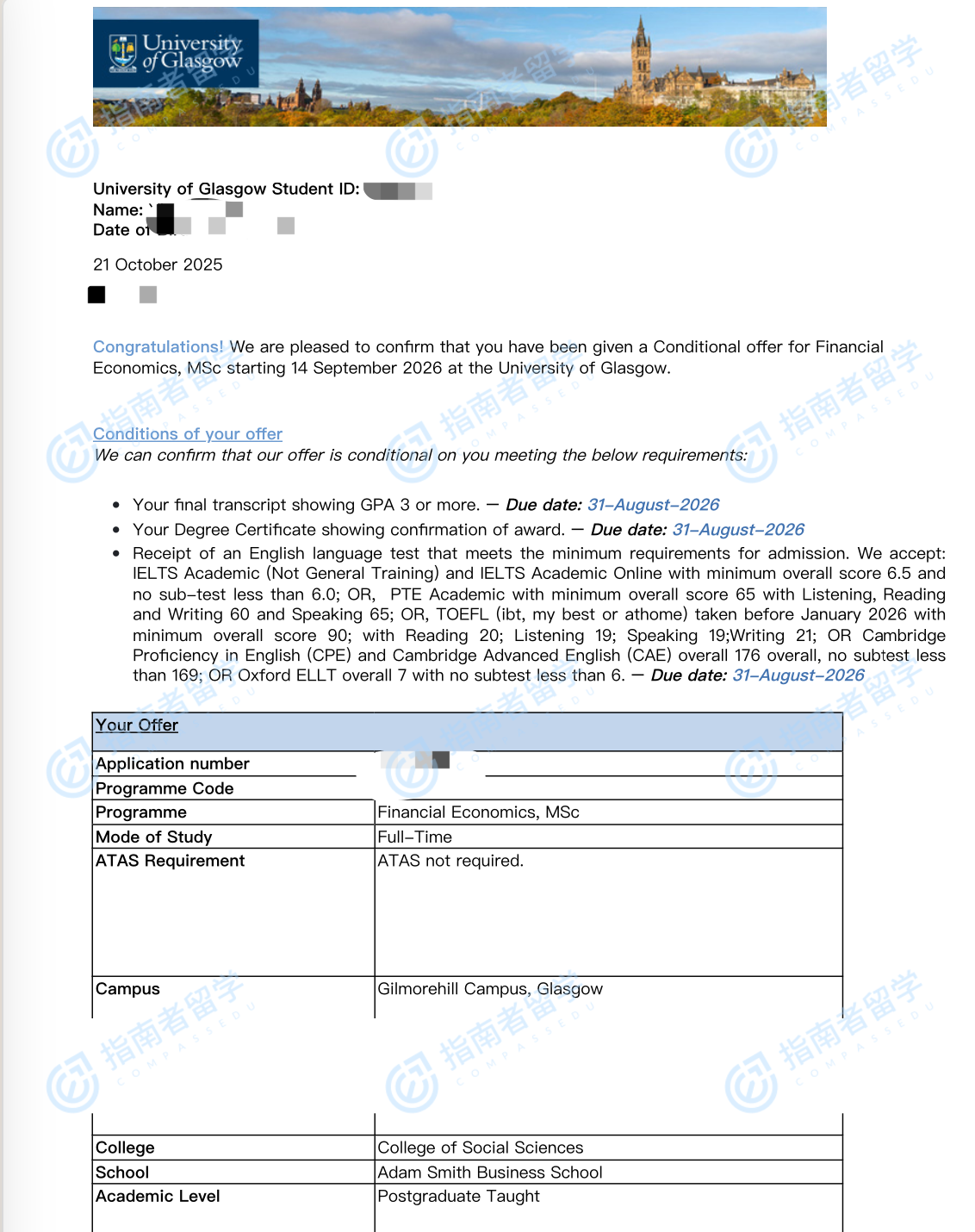 格拉斯哥大學(xué)金融經(jīng)濟(jì)學(xué)理學(xué)碩士研究生offer一枚