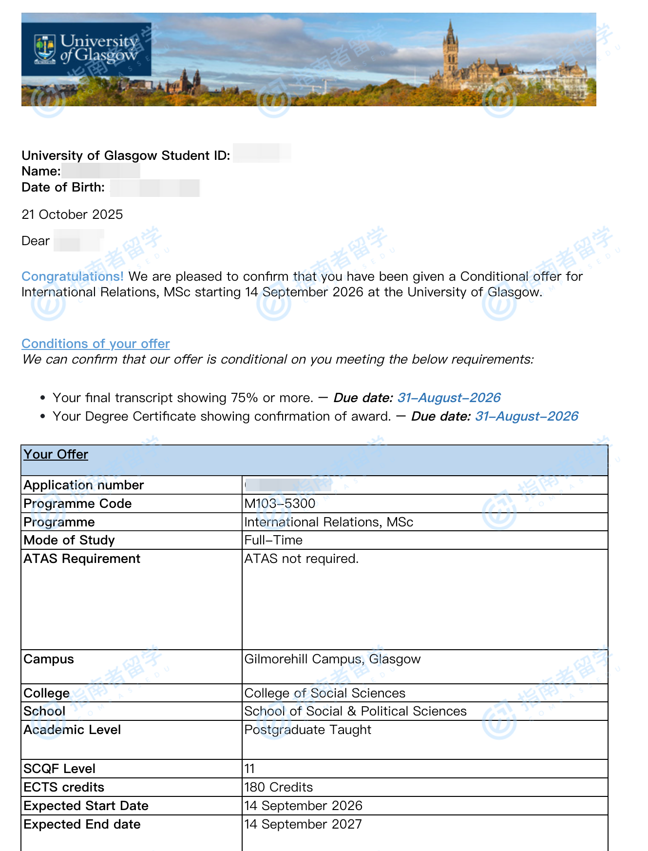 格拉斯哥大學(xué)國際關(guān)系理學(xué)碩士研究生offer一枚