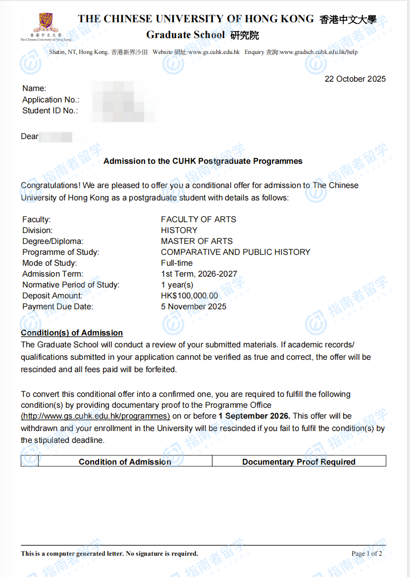 香港中文大學(xué)比較及公眾歷史學(xué)文學(xué)碩士研究生offer一枚
