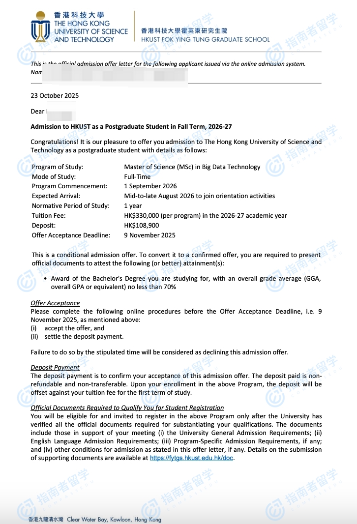 香港科技大學大數(shù)據(jù)科技理學碩士研究生offer一枚