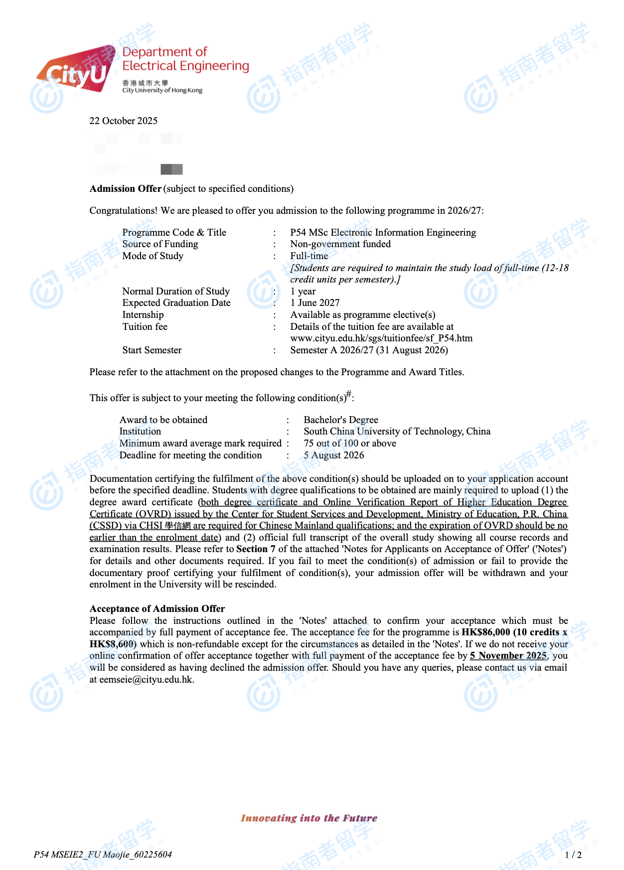 香港城市大學(xué)電子資訊工程學(xué)理學(xué)碩士研究生offer一枚